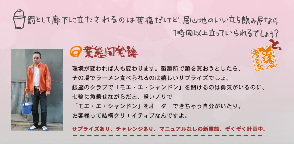 “商いと笑顔の舞台店”=「笑店」のトータルプロデュースを行う商店製作創造集団。「浜倉的な商店を空気感まで製作していく創造集団」。