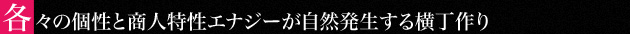 施設環境により各々独自テーマとコンセプトを決め共感する個性ある商人特性各々の店舗を集め、キャスティングし、お互い協力し合うことで生まれる各々の個性と商人特性エナジーが自然発生する魅力的な横丁になります。